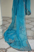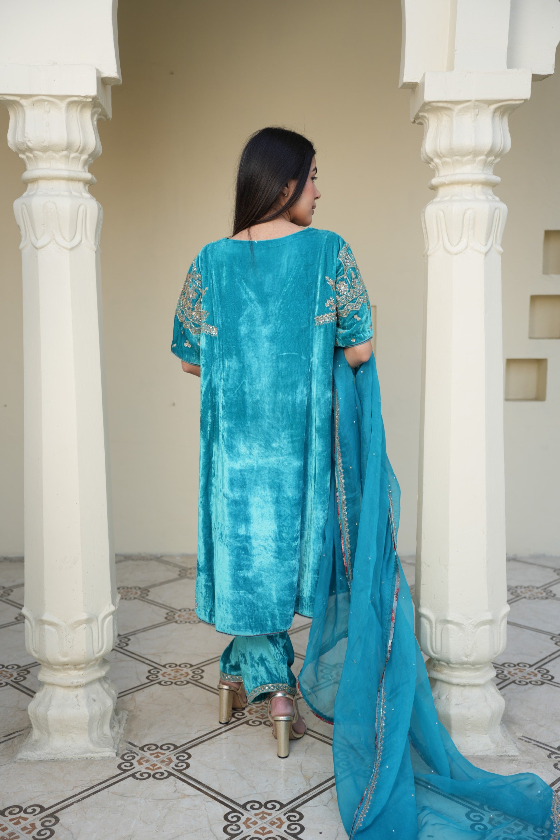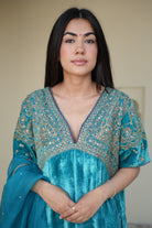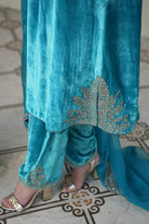 A velvet sky blue suit with delicate neck embroidery exudes elegance and charm. The soft, luxurious fabric in a serene sky blue creates a refined silhouette, while intricate embroidery on the neckline and short slits adds a touch of sophistication. Perfect for formal events or special occasions, this ensemble balances grace with subtle artistry.