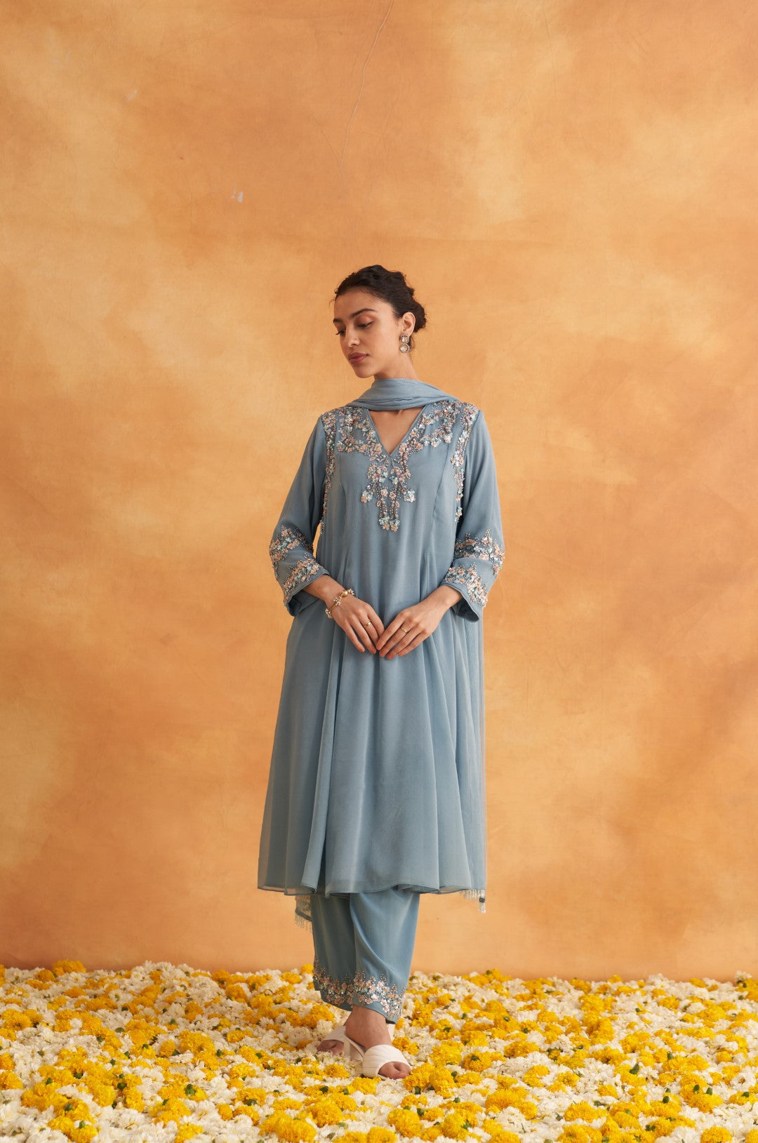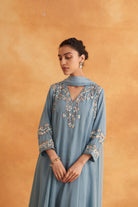 This outfit is crafted from pure fabric. To maintain its quality, colour, and finish, dry clean only is recommended