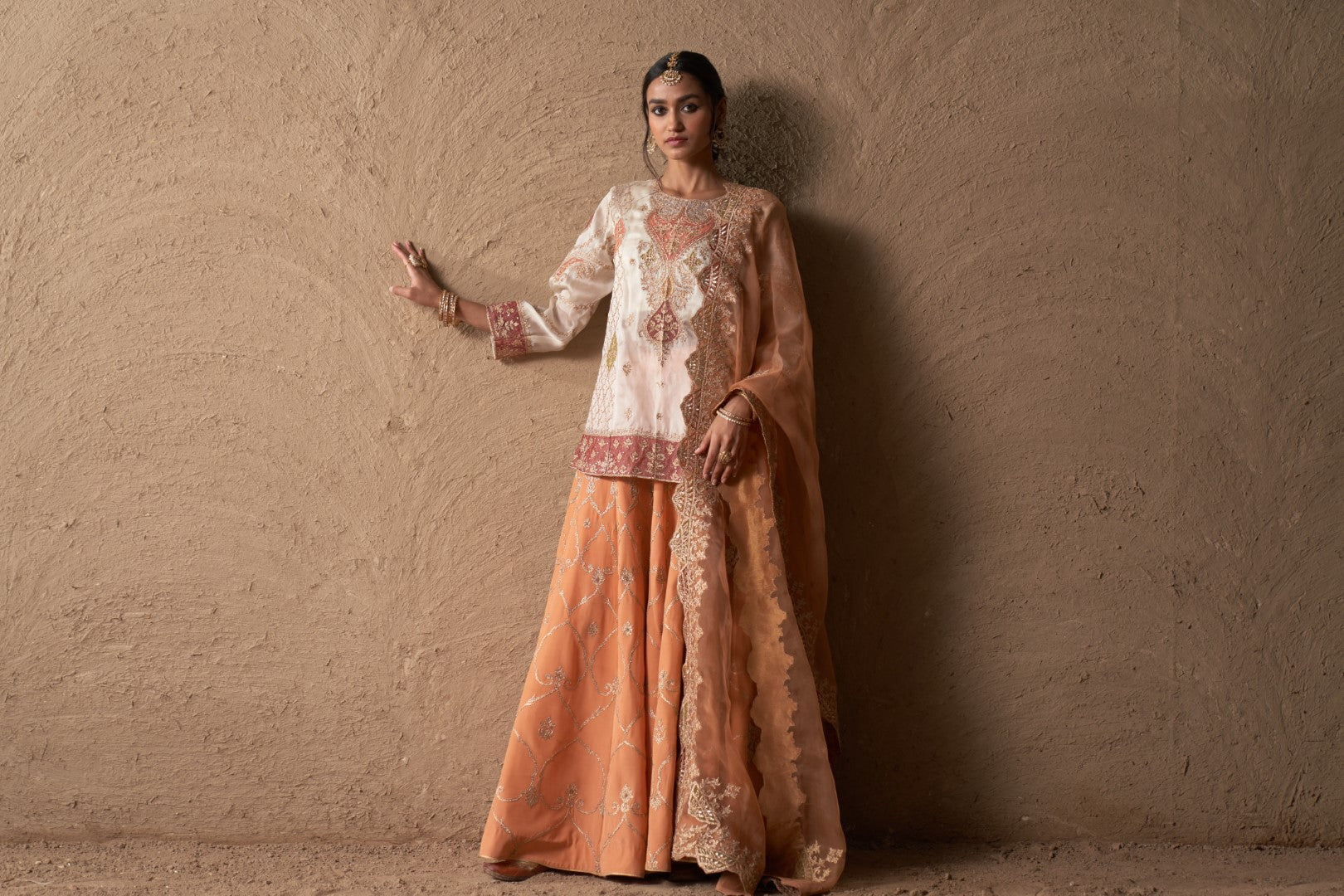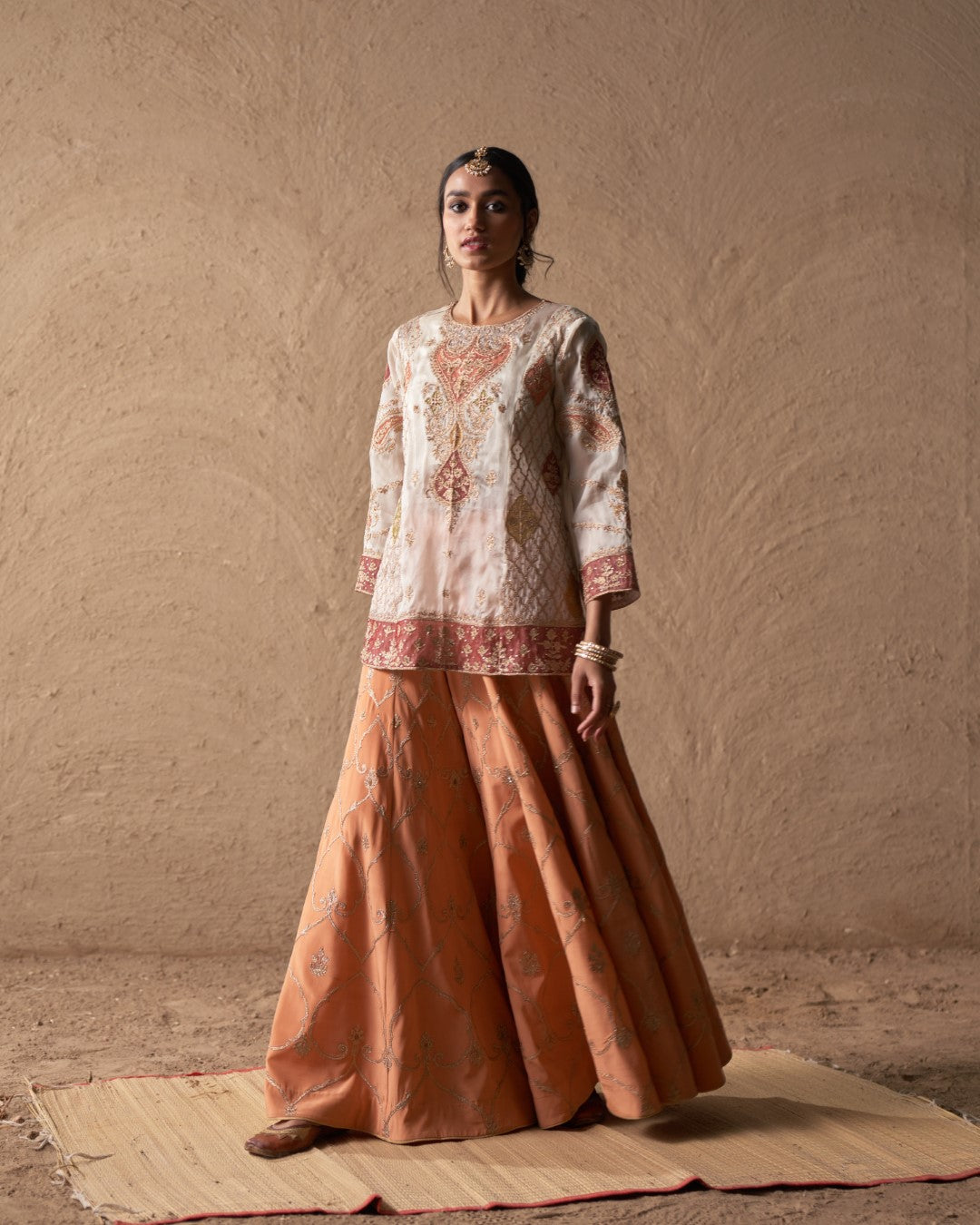 This outfit is crafted from pure fabric. To maintain its quality, colour, and finish, dry clean only is recommended