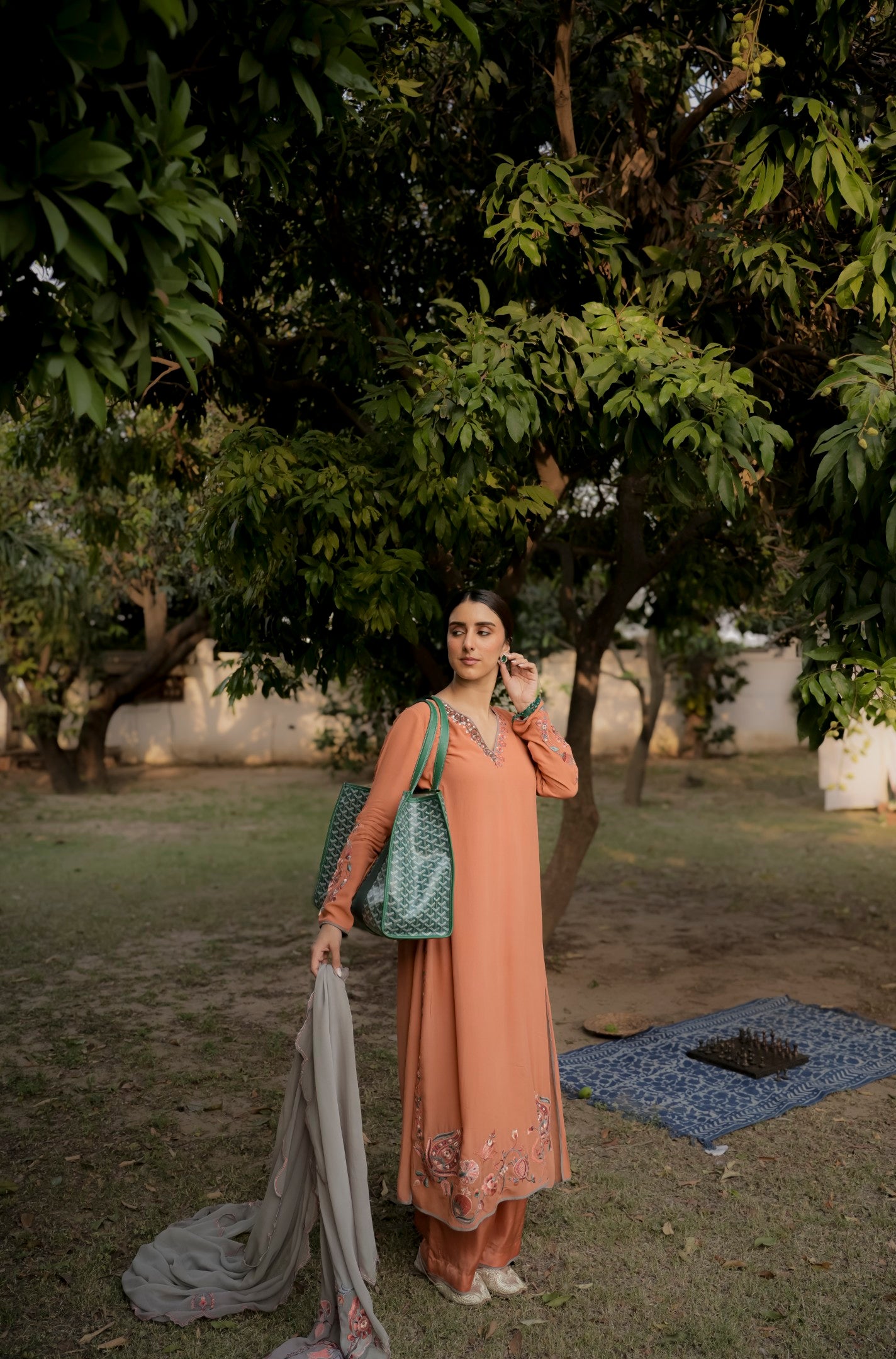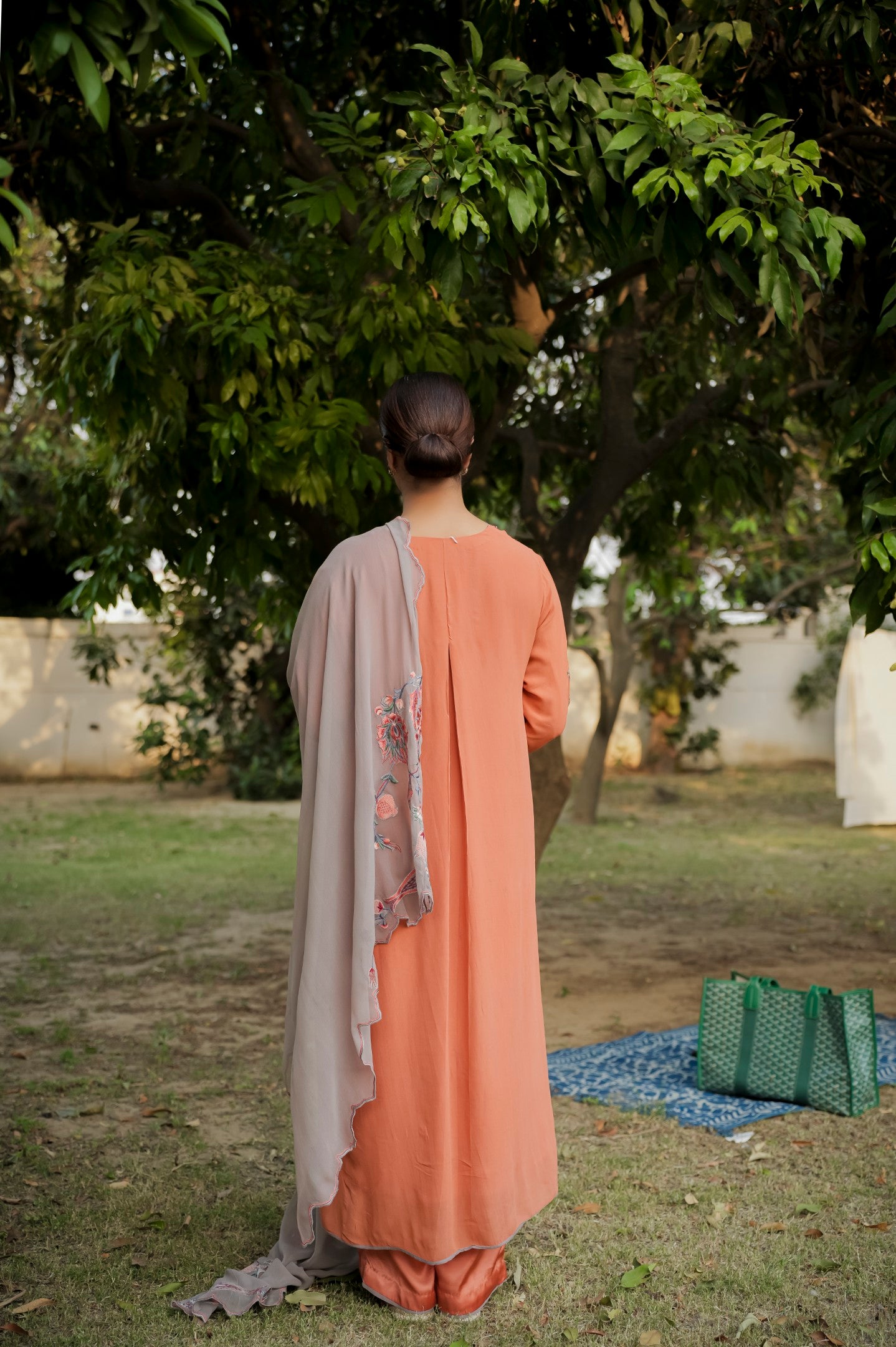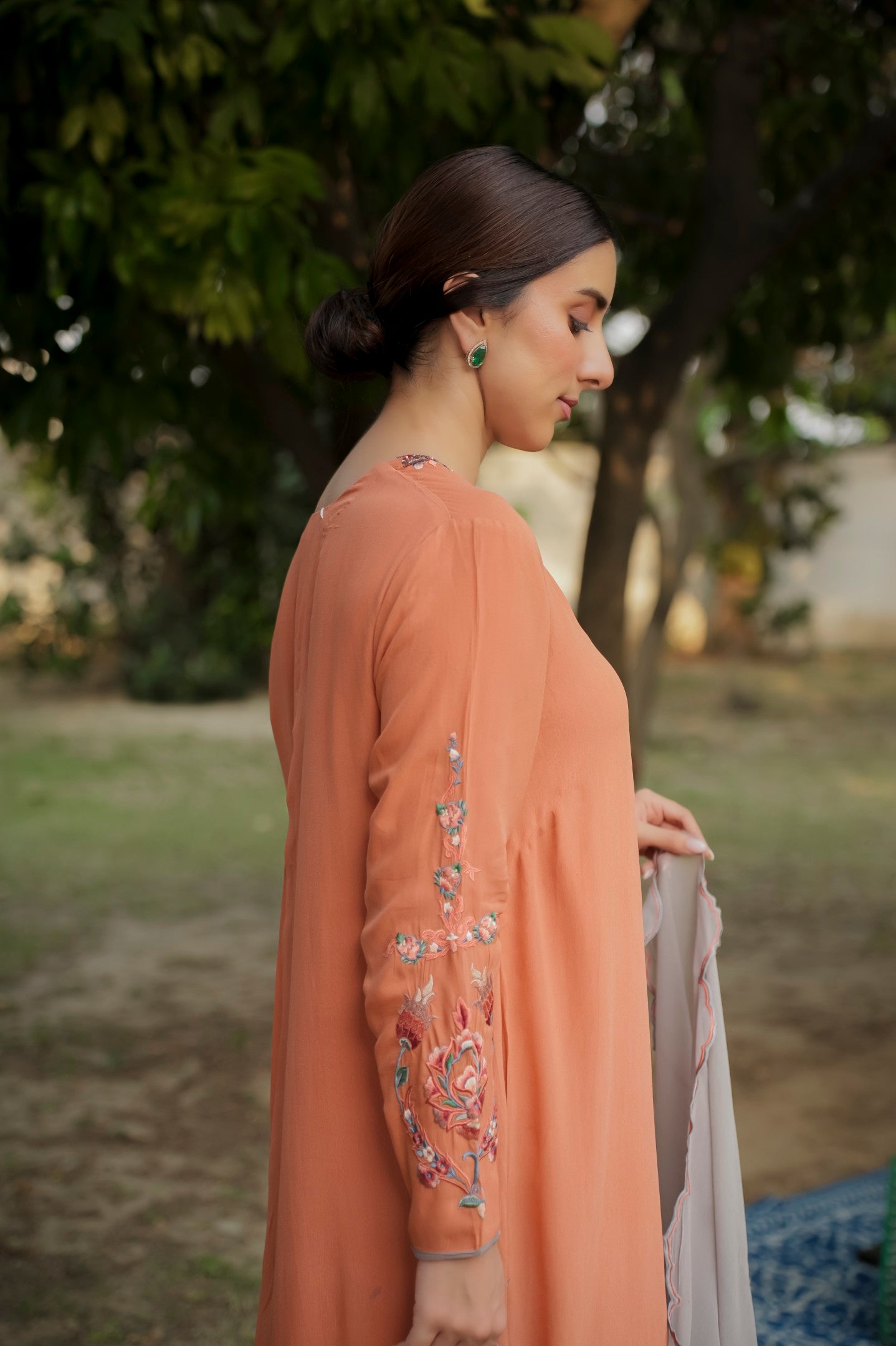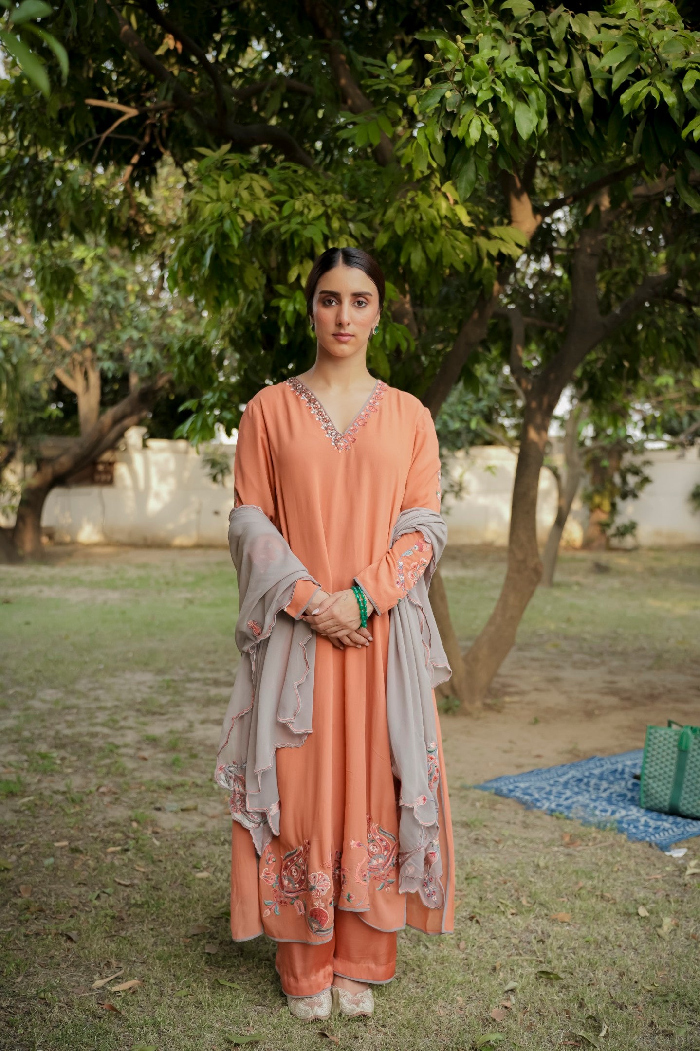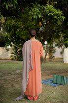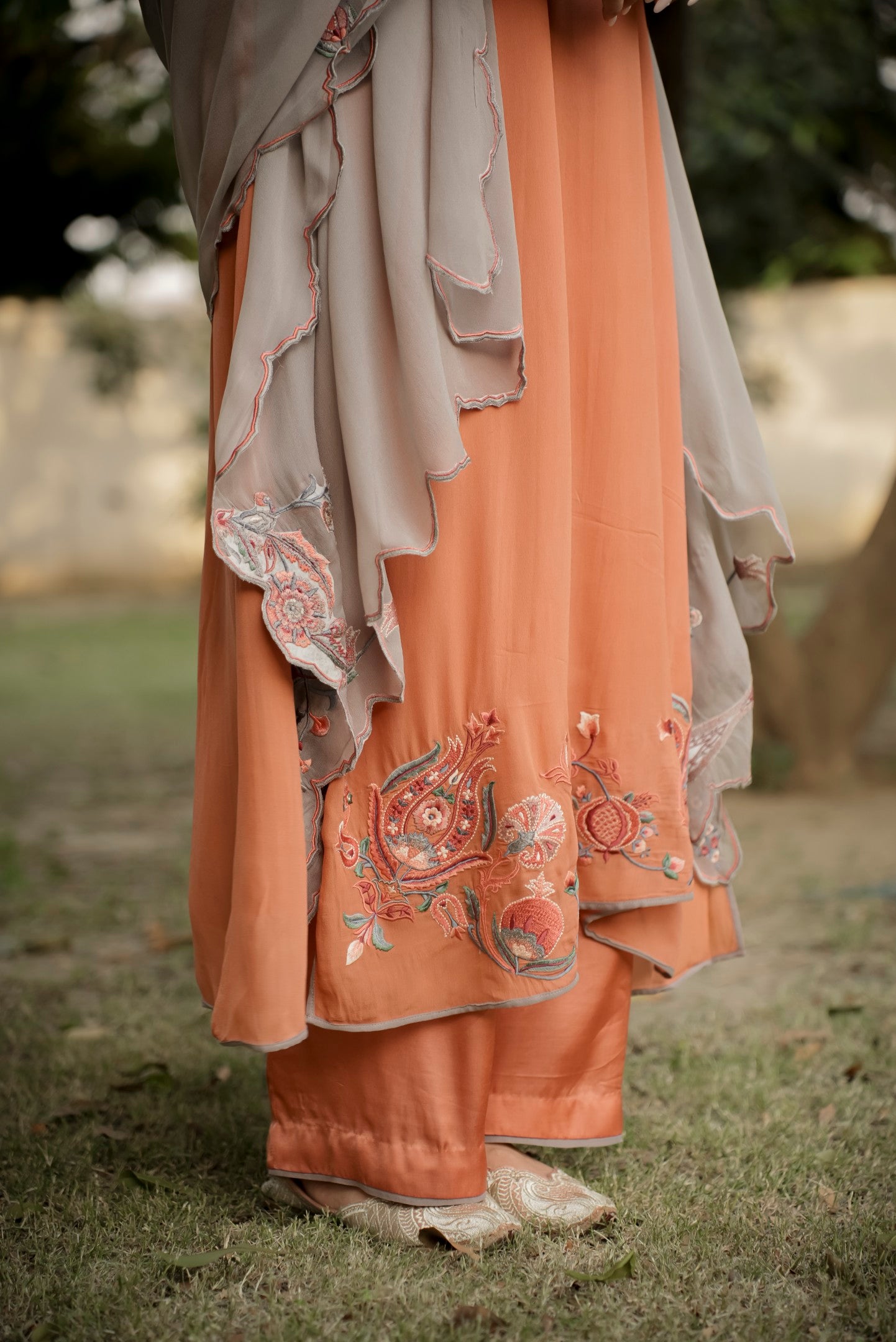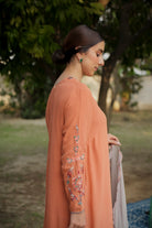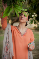 Blend of subtle charm and handcrafted beauty, this orange georgette suit features light thread embroidery along the ghera, with tints of delicate hand embroidery that add a soft, artisanal touch. Paired with a contrasting grey dupatta, it strikes the perfect balance between brightness and calm ideal for elegant daywear or understated festive moments.