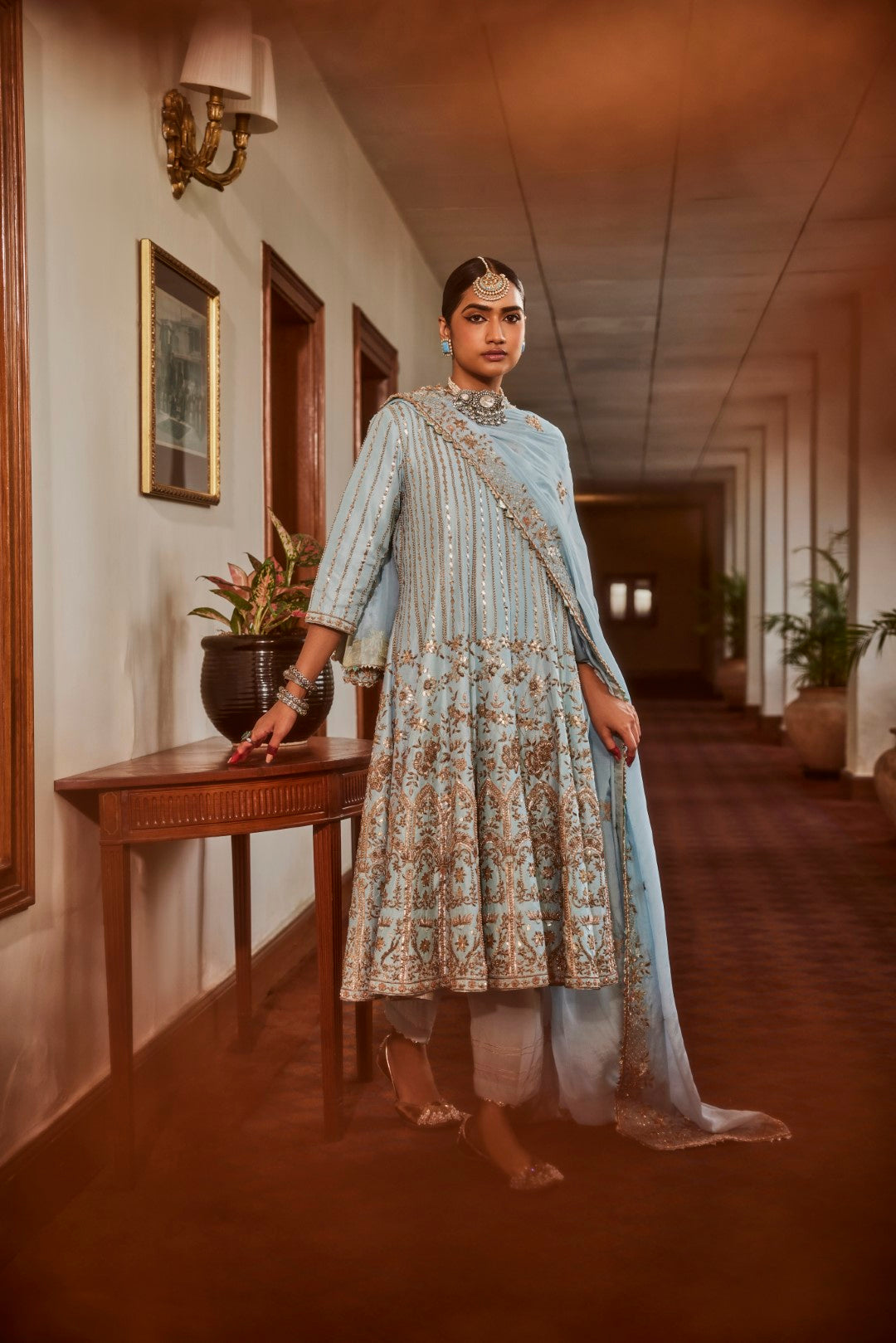 This outfit is crafted from pure fabric. To maintain its quality, colour, and finish, dry clean only is recommended