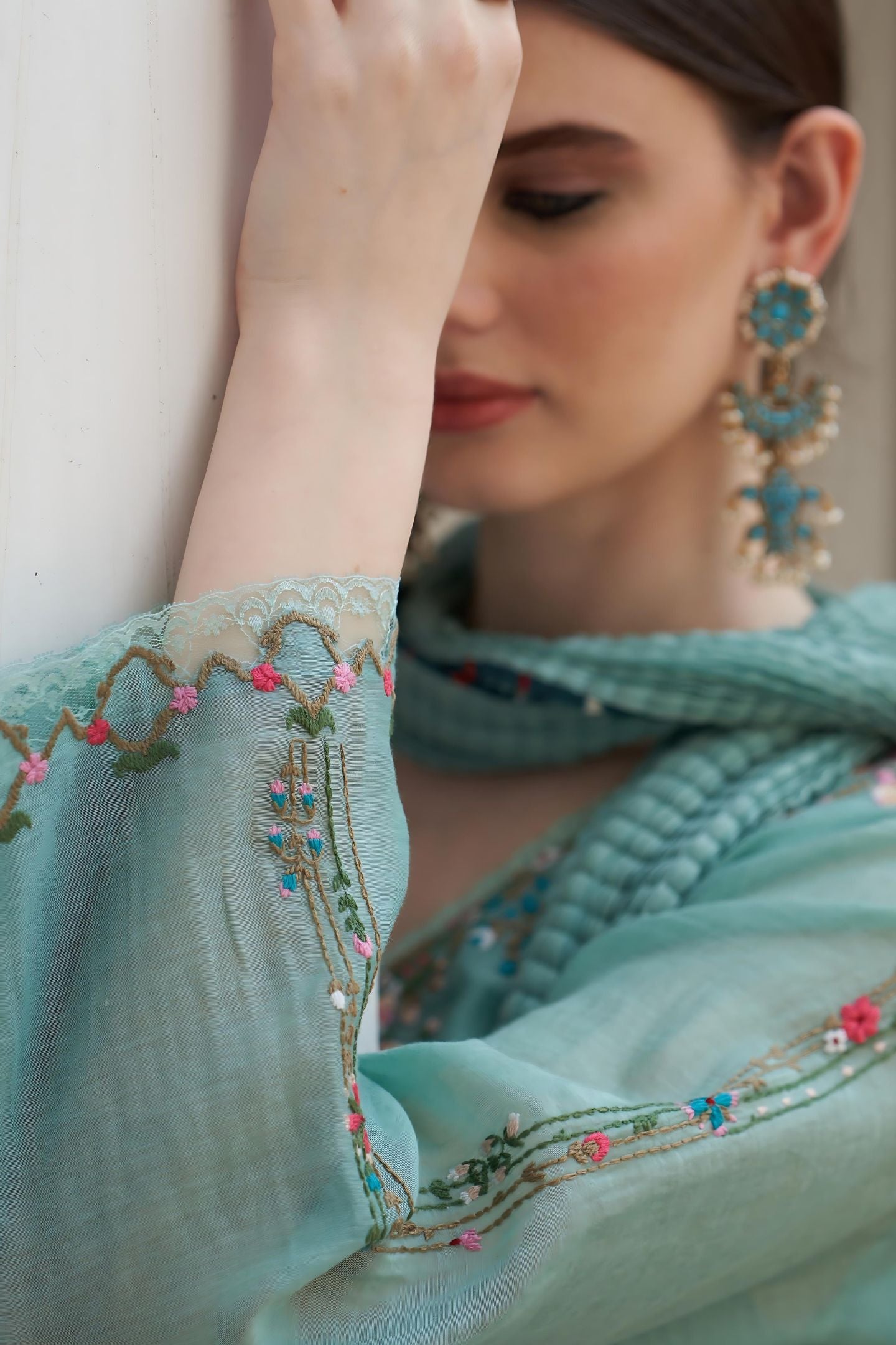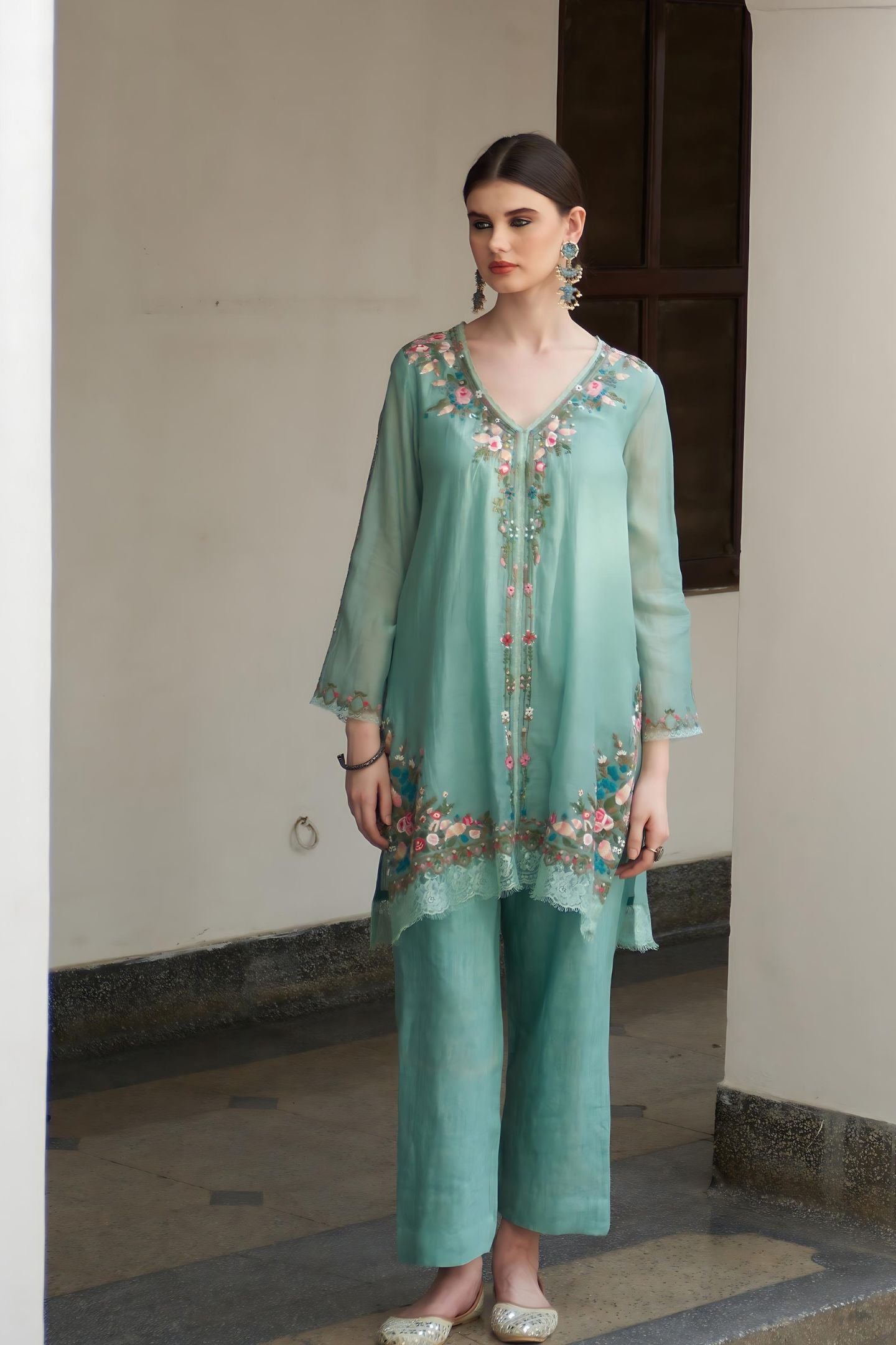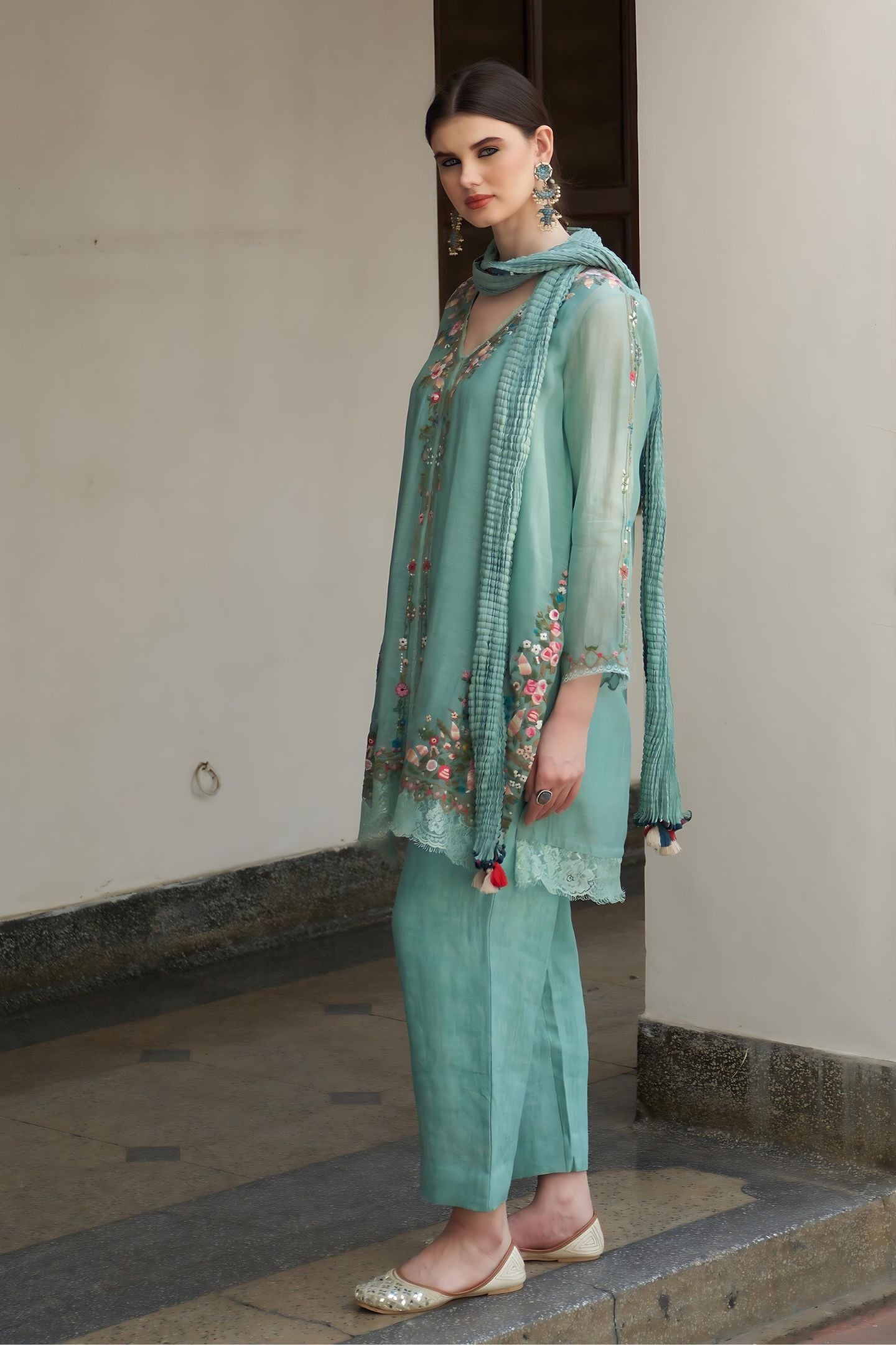 Indulge in luxury with a light sea green blue Chanderi shirt layered over a crepe undershirt, complemented by linen pants. Complete the ensemble with a crushed Chanderi dupatta featuring intricate threaded machine pink floral embroidery on the shirt. This ensemble exudes sophistication and modern elegance, perfect for making a statement at any upscale affair.