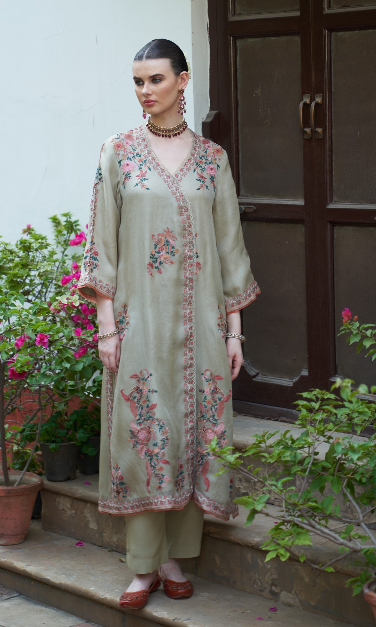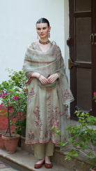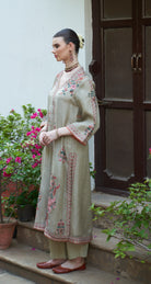 Sea-green exudes elegance in an all-over suit ensemble, where organza shirt meets the touch of crepe lining and pants. A peach aari embriodery in jacket form adds a touch of regal sophistication to complete the ensemble.