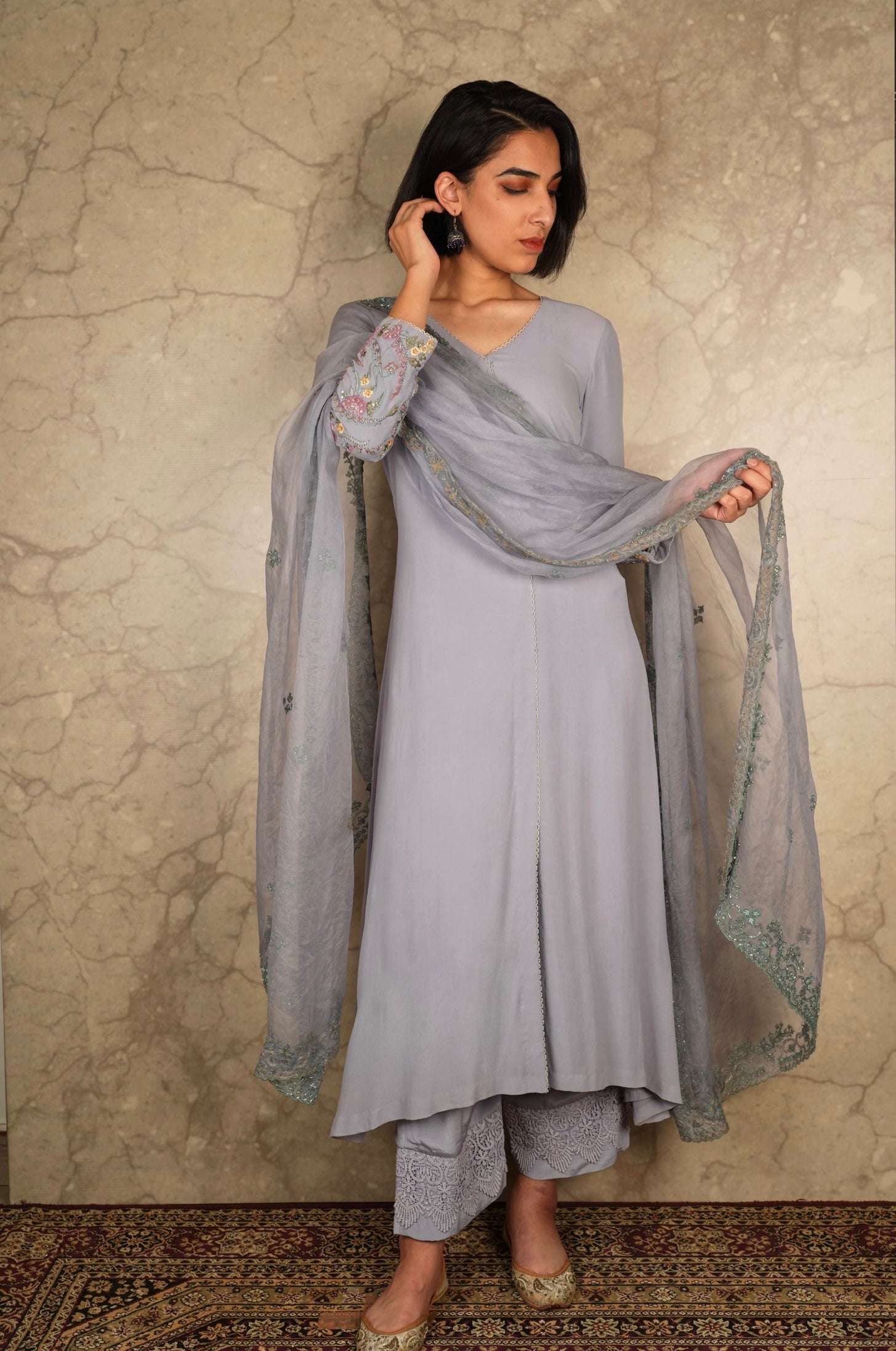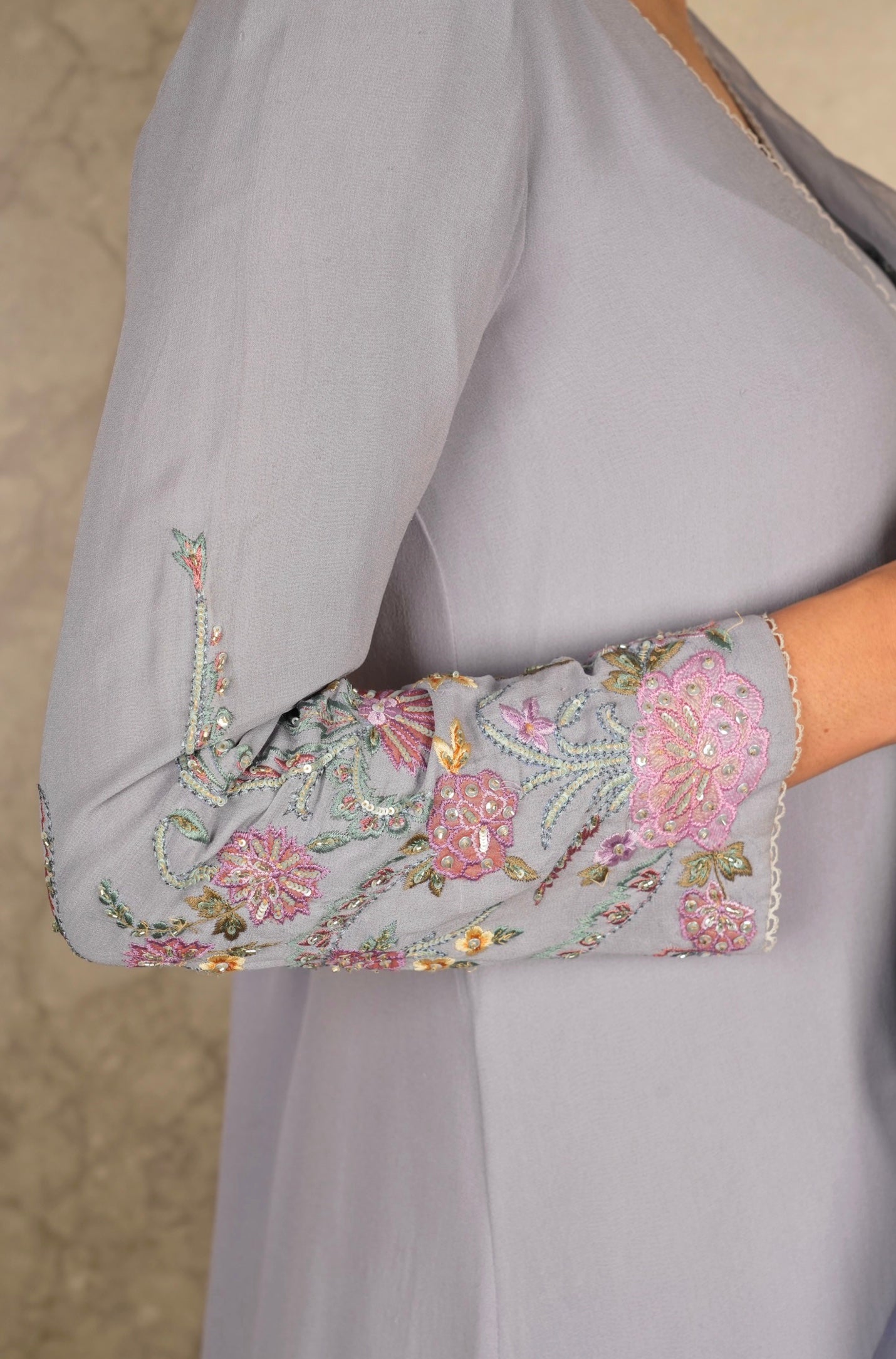 This outfit is crafted from pure fabric. To maintain its quality, colour, and finish, dry clean only is recommended