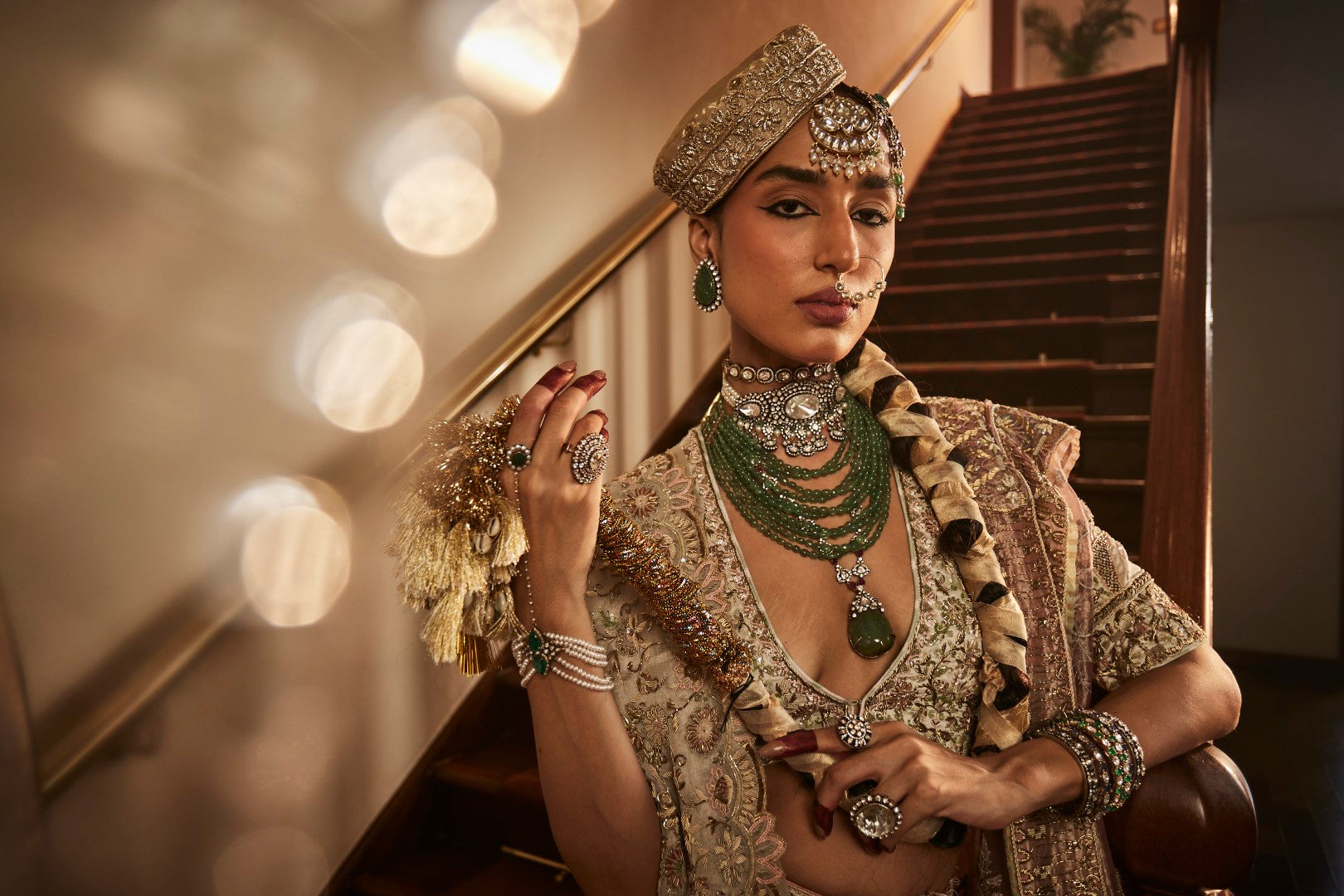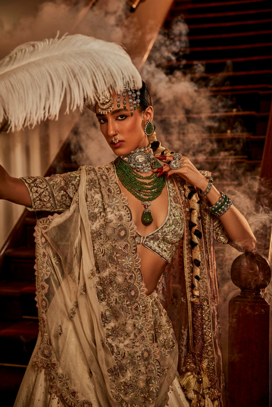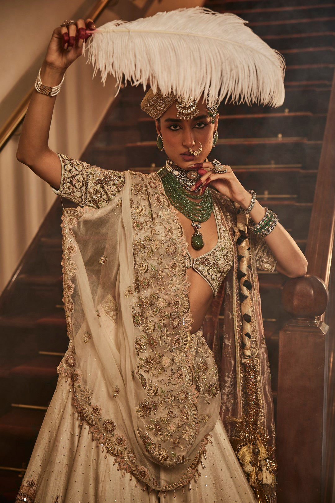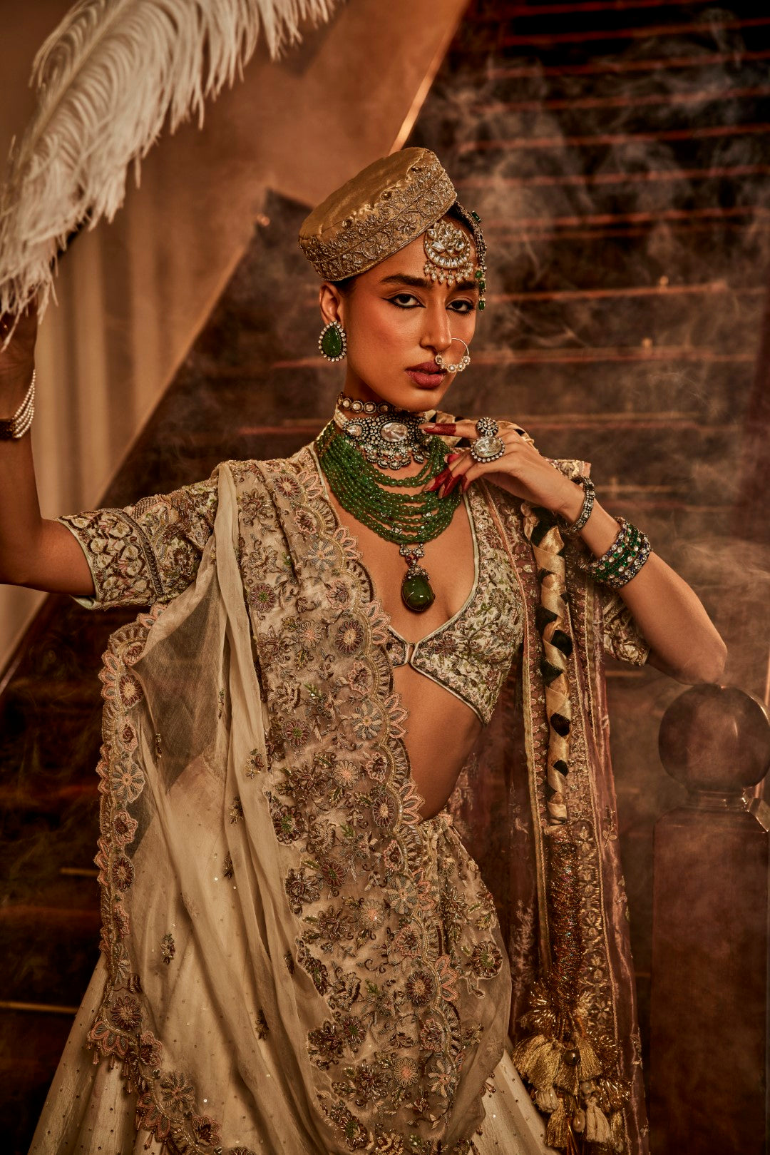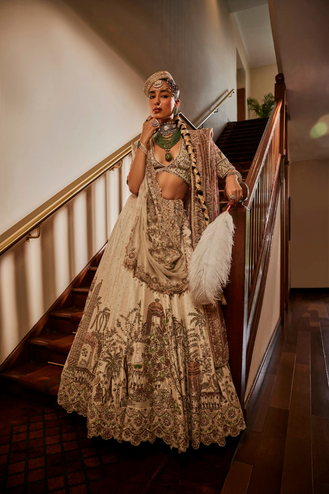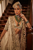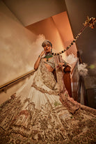 Our signature baagh lehenga with an 8m flair and a pink organza dupatta and an ivory organza dupatta. It brings dyed marbe, dabka, qora and kachra in a beautiful symphony.