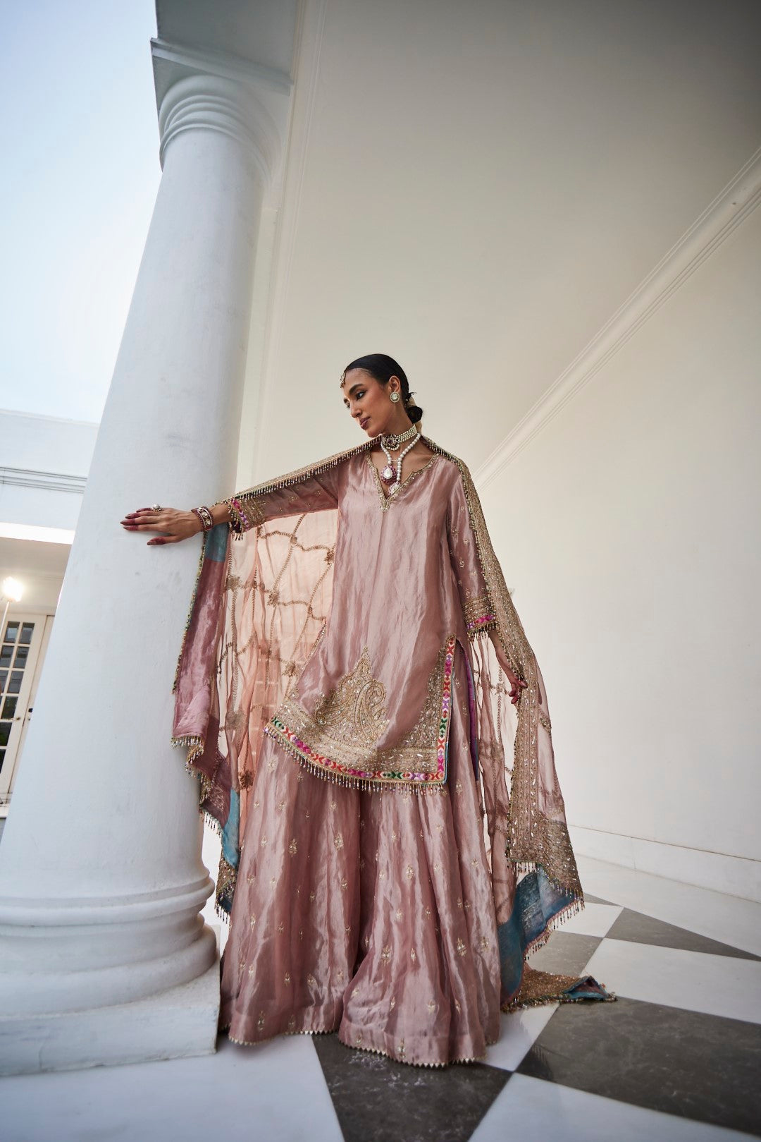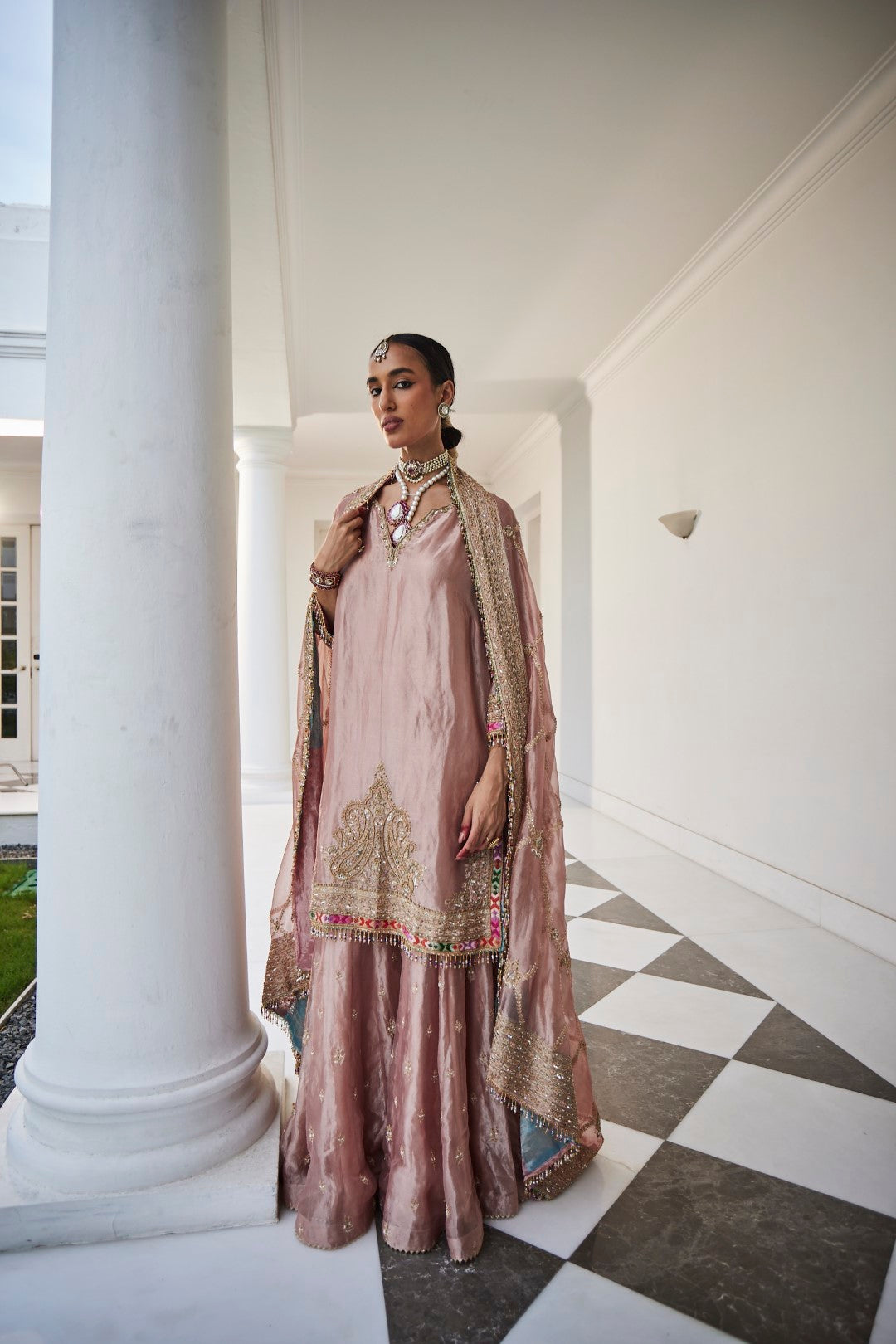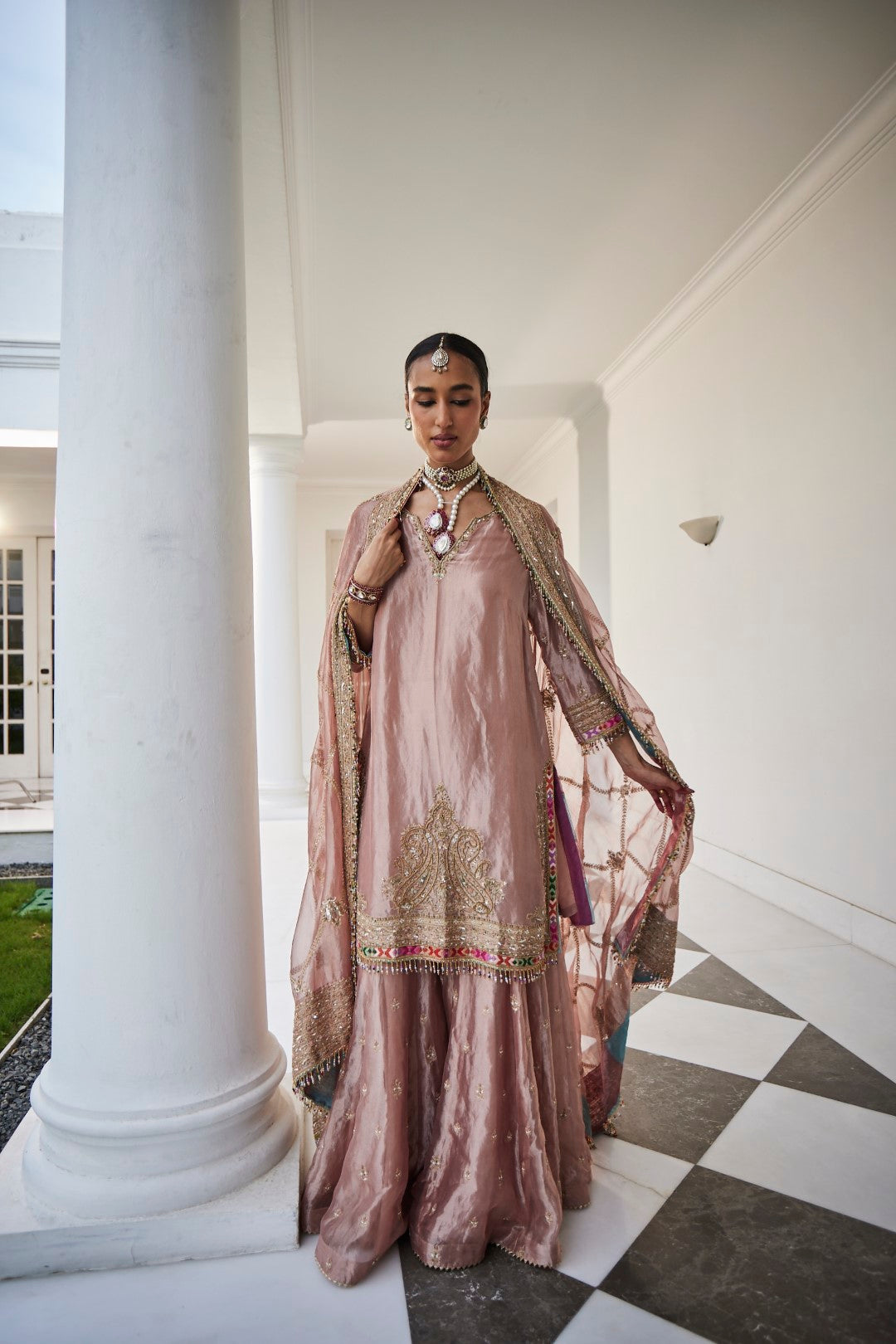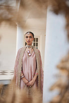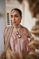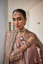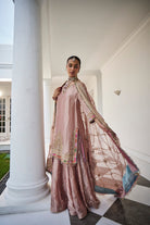 A shimmering silver tissue embroidered shirt, paired with matching tissue sharara pants and an exquisite tissue jaal dupatta, creating an ensemble that radiates elegance and grace.