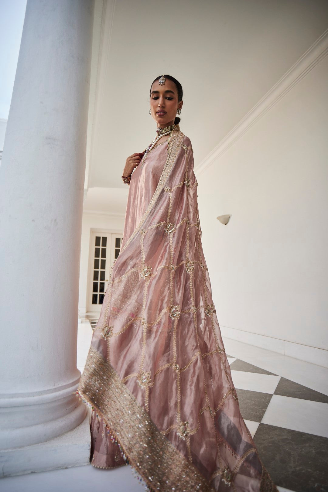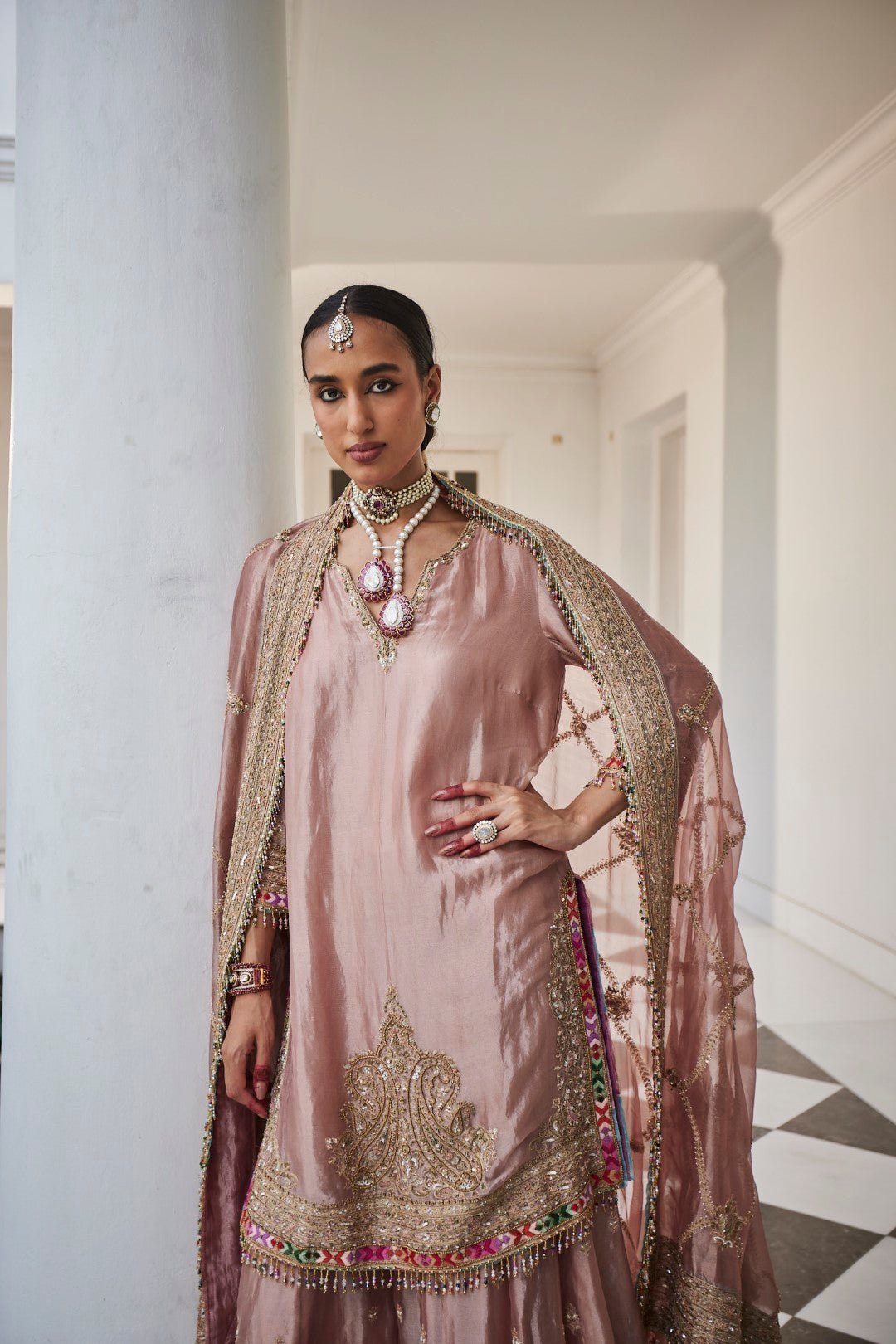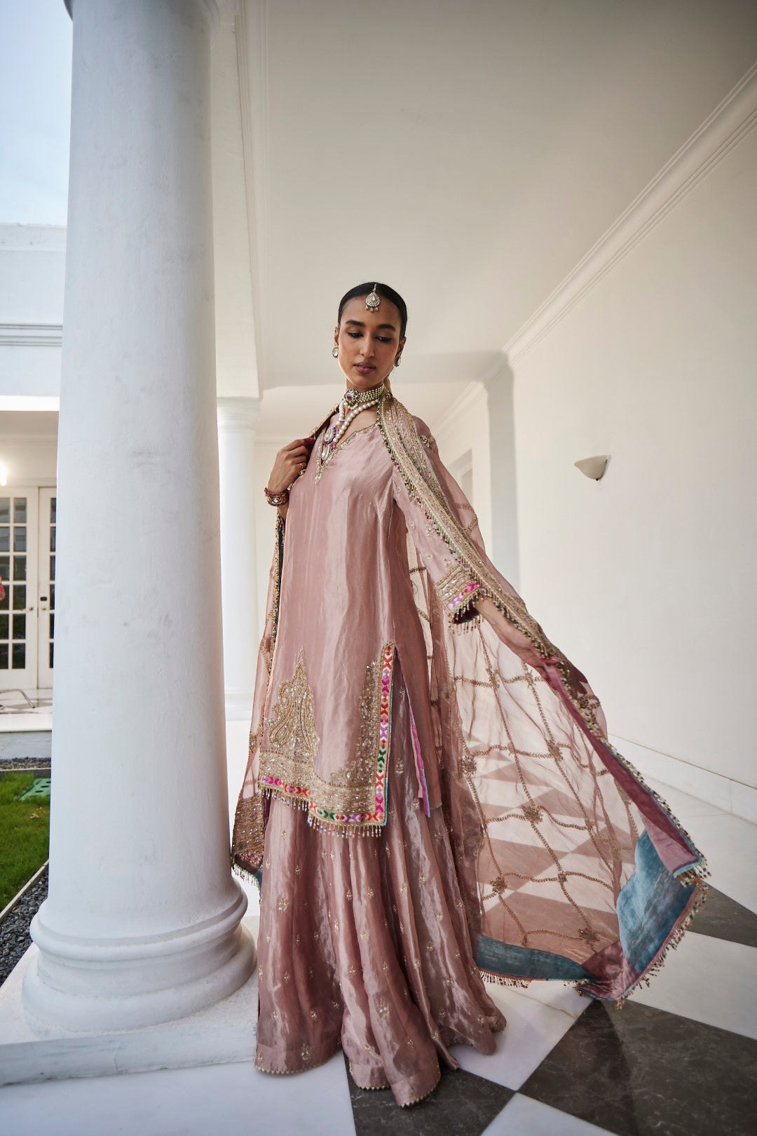 A shimmering silver tissue embroidered shirt, paired with matching tissue sharara pants and an exquisite tissue jaal dupatta, creating an ensemble that radiates elegance and grace.