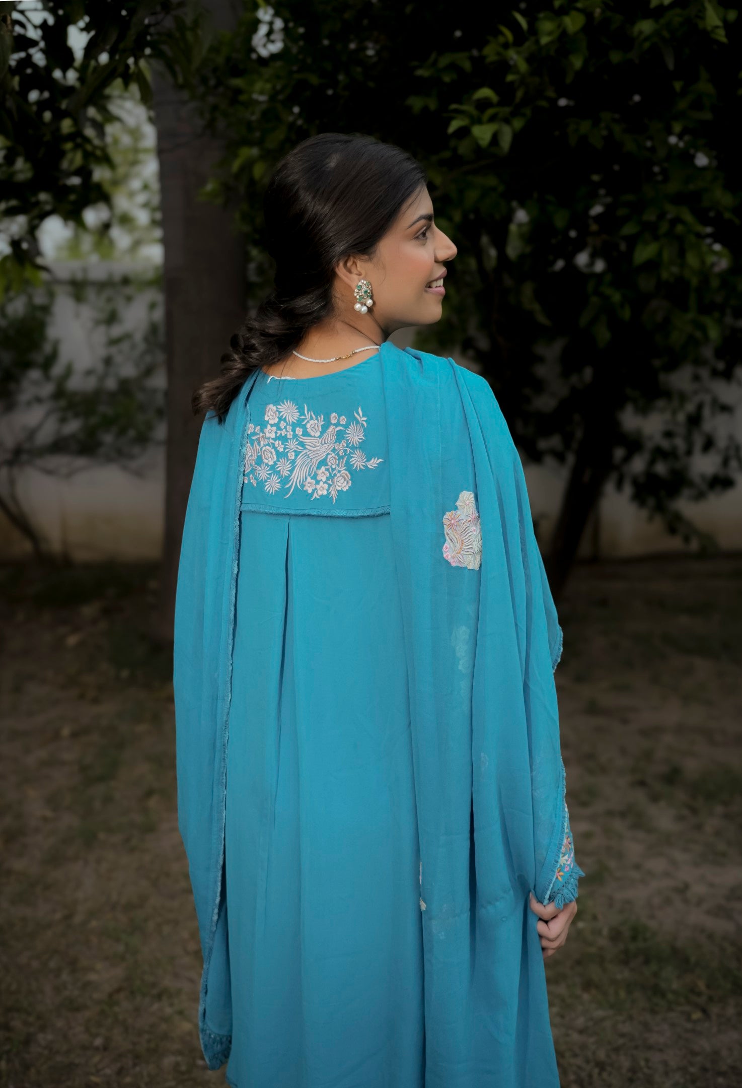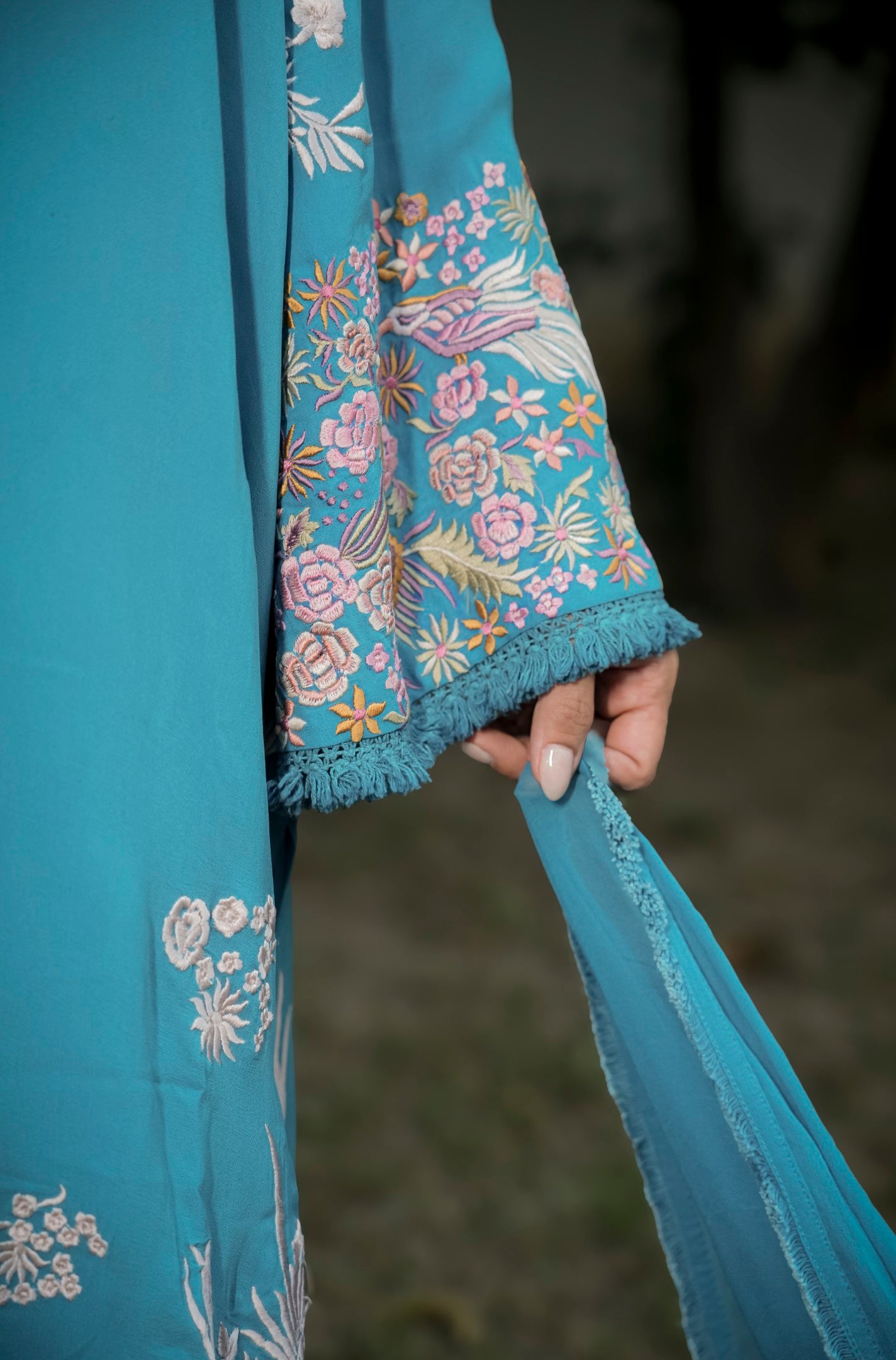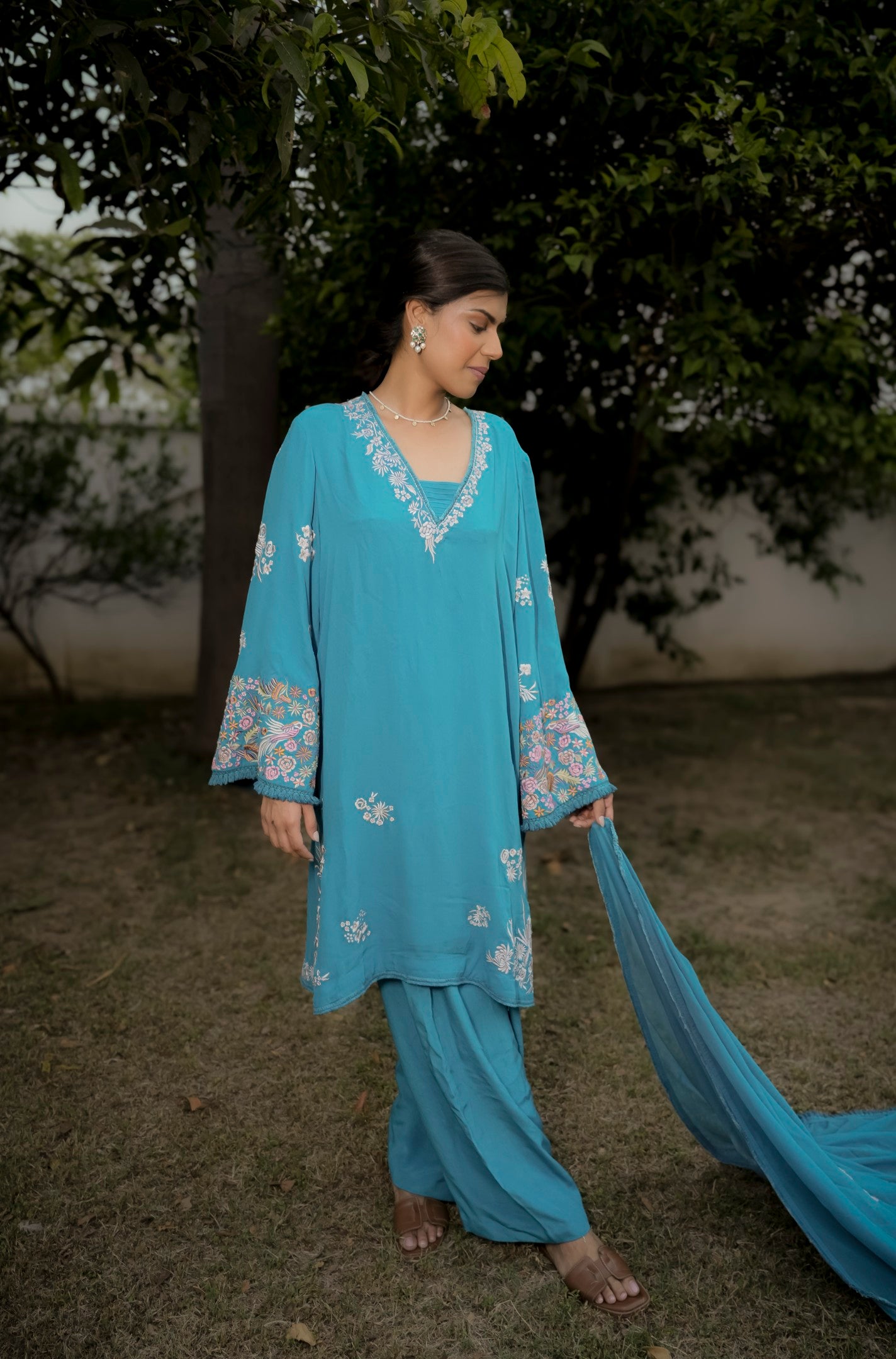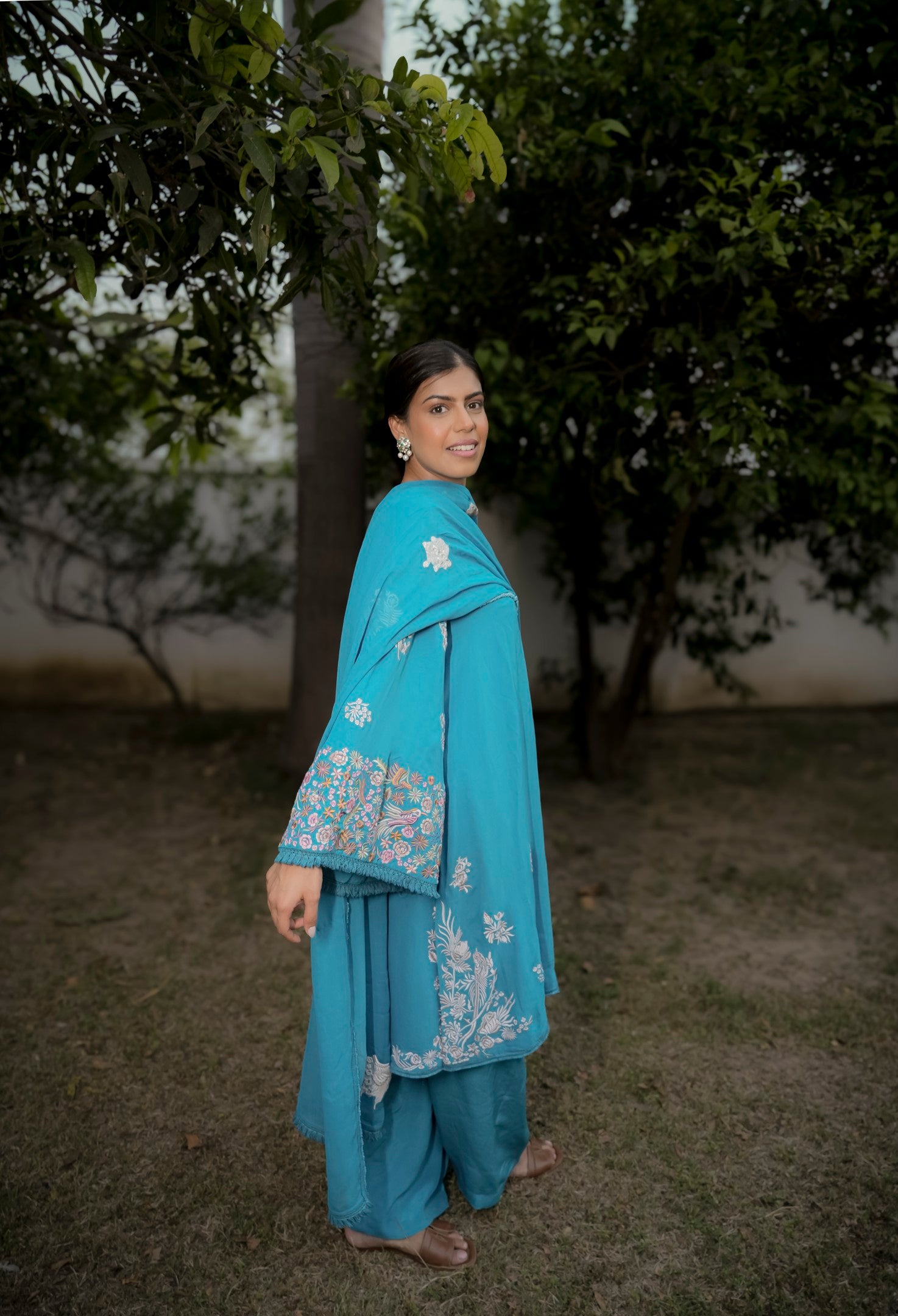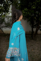 This elegant ferozi georgette shirt features timeless Parsi embroidery across the front, adding intricate detail to its soft, flowing silhouette. Designed with dramatic bell sleeves, it moves beautifully and adds a statement touch to any look. Light, breezy, and effortlessly stylishperfect for festive moments or a graceful day out.
