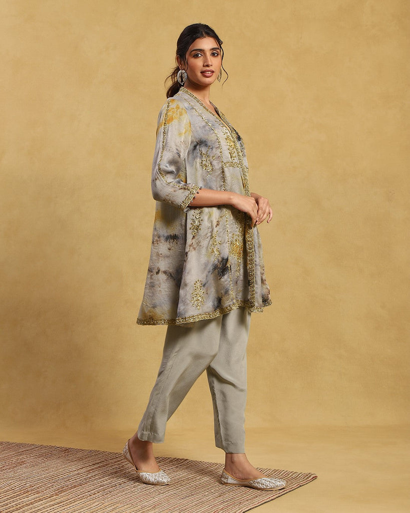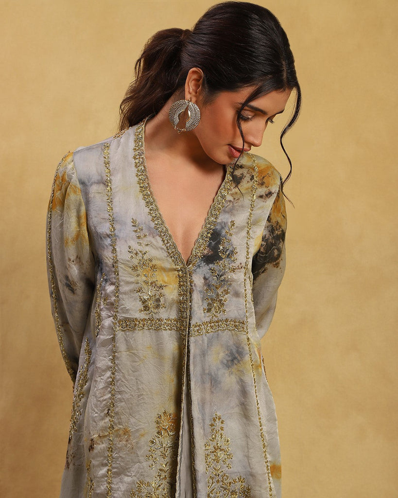 A contemporary and chic grey tie-dye salwar kameez, embodying a fusion of modern style and traditional grace.