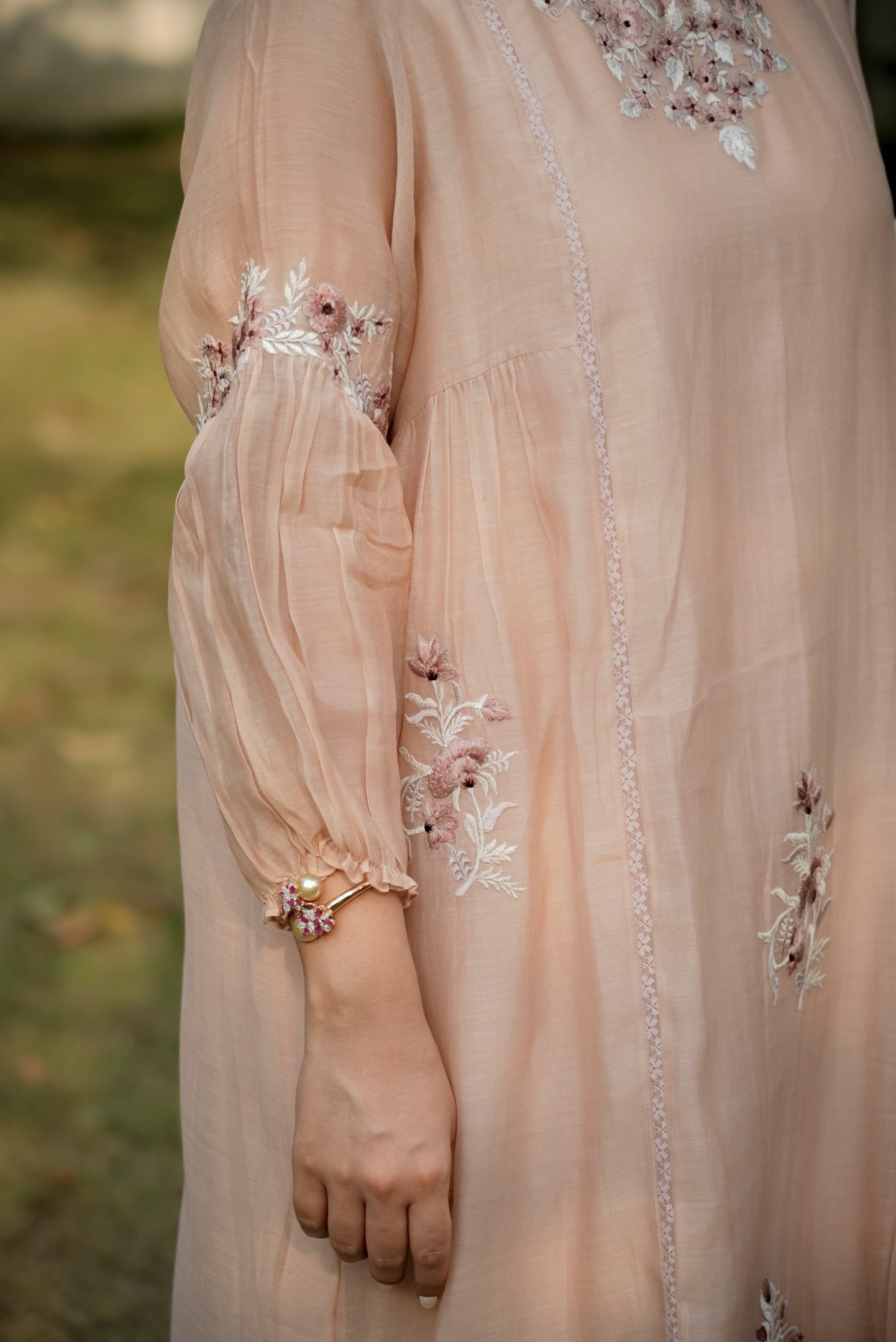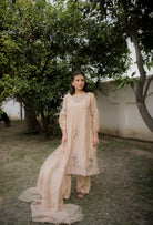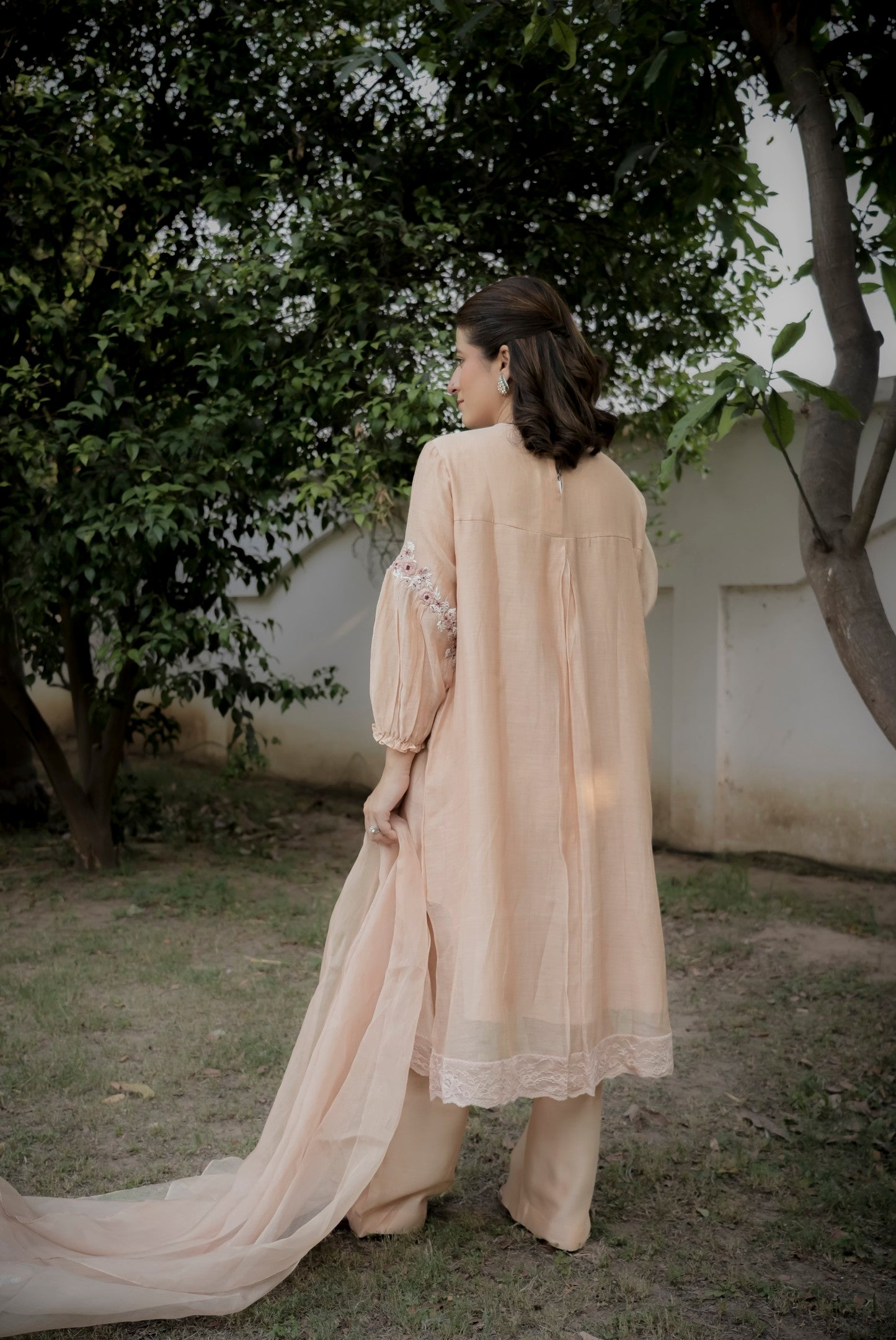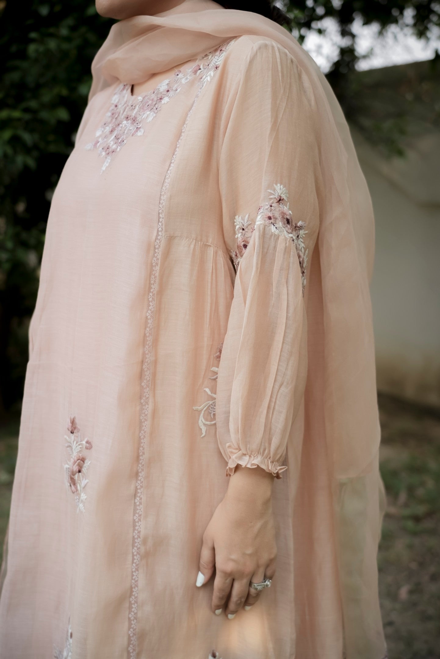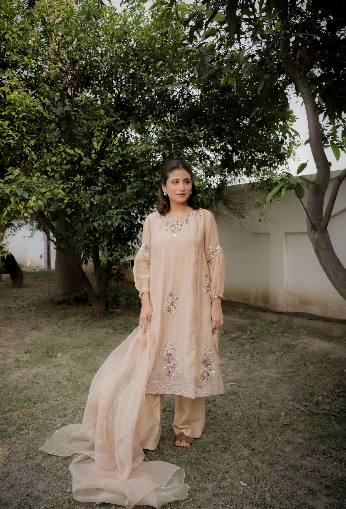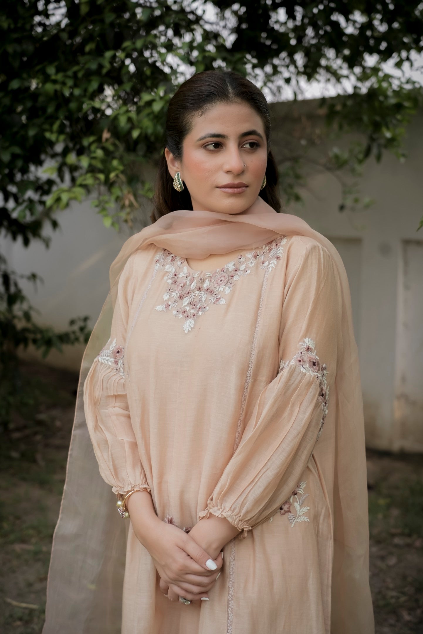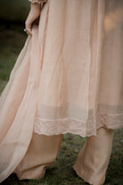 Ethereal elegance meets artisanal grace in this lightest beige-peach suit crafted from airy mul Chanderi. The fabric drapes like a whisper, offering a feather-light feel that's perfect for warm days and intimate occasions. Delicate thread embroidery dances across the surface in soft, tonal hues, lending a handcrafted charm without overwhelming the eye.