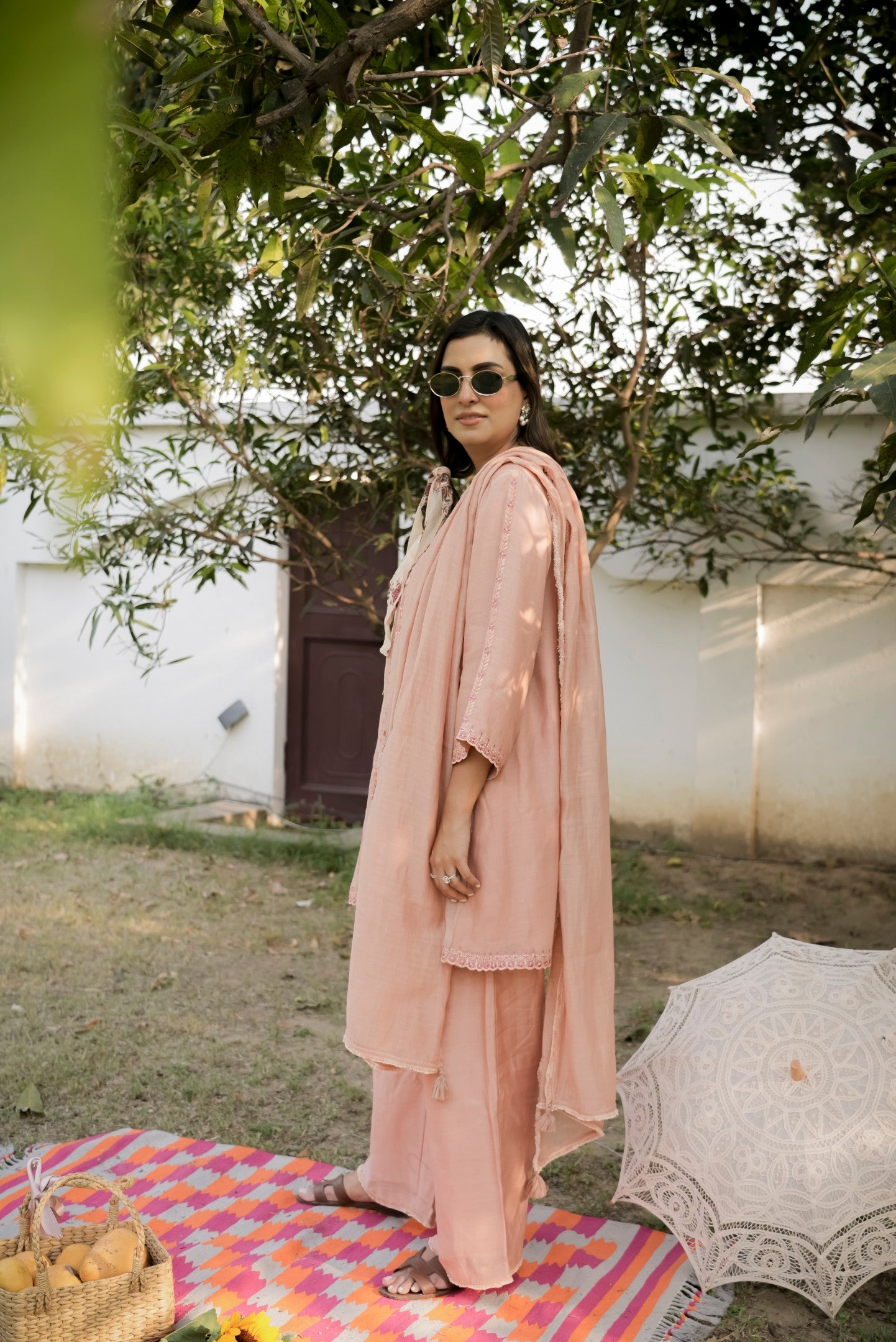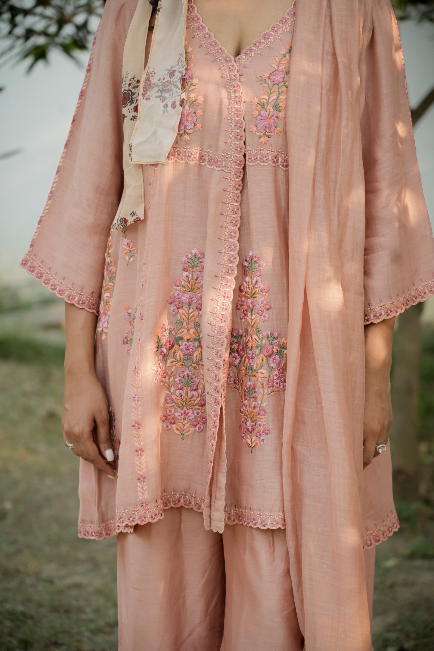 Crafted in airy Chanderi, this elegant Peach Angrakha set showcases a timeless wrap silhouette that flatters effortlessly. The kurtas graceful drape and delicate detailing highlight the richness of traditional design. Paired with straight-cut pants, it's a perfect blend of comfort and heritage.